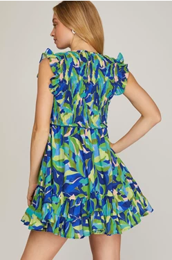 Leaf Print V-Neck Smocked Ruffle Sleeve Dress-Blue