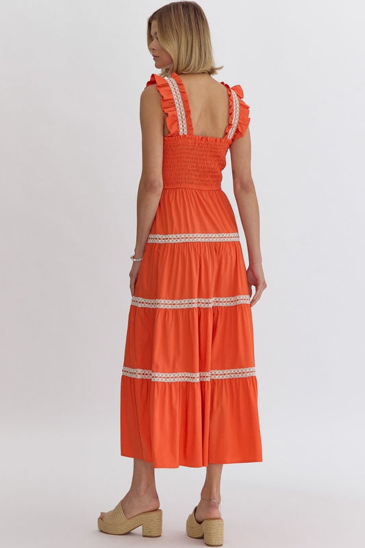 Solid Square Neck Smocked Top Lace Trim Midi Dress - Orange