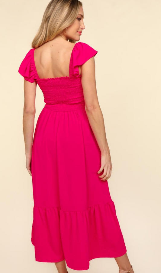 Solid Square Smocked Top Ruffle Hem Dress - Fuchsia