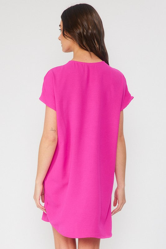 Solid V-Neck Front Pleat Short Sleeve Dress- Fuchsia