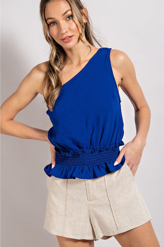 Solid Asymetrical Shoulder Ruffle Cinch Waist Top