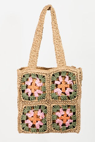 Straw Floral Square Patchwork Tote