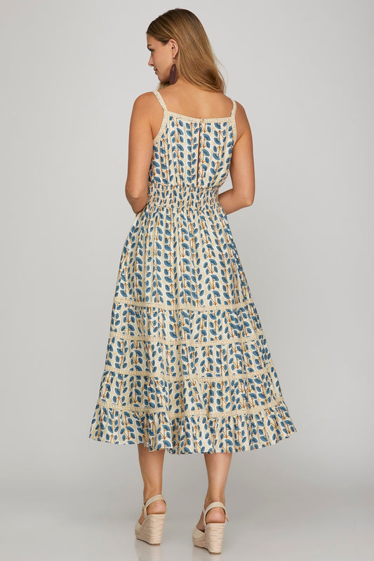 Sleeveless Ginkgo Leaves Tiered Crochet Trim Midi Dress-Blue