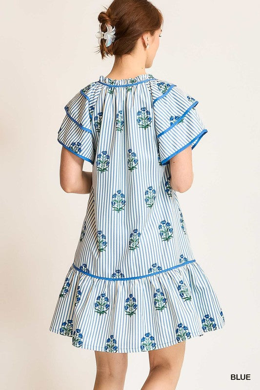 Striped Tiered Sleeve Dress w/ Floral Embroidery -Blue