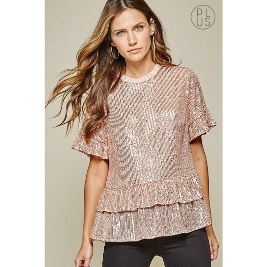 Sequin Tiered Mock Ruffle Neck Top-Rose