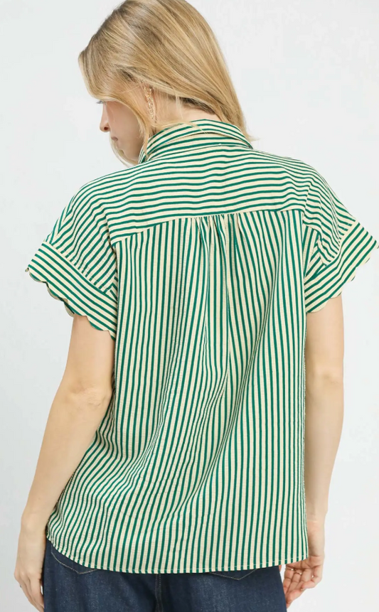 Striped Collared Button Scallop Sleeve Top-Green