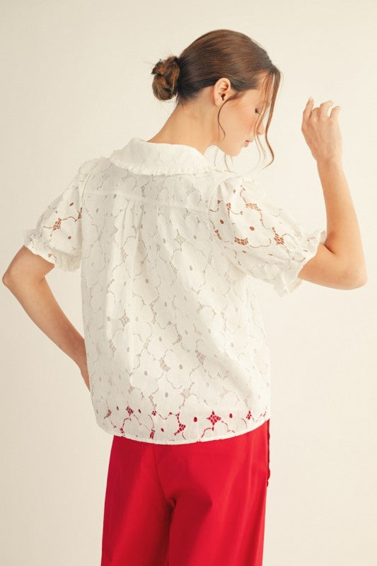 Scallop Crochet Half Button Collared Sweater-Ivory/Nvy