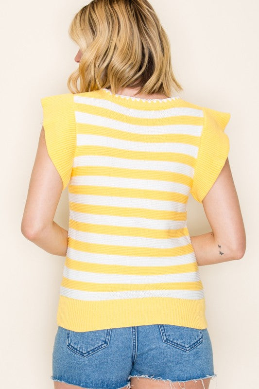 Striped Ruffle Contrast Short Sleeve Sweater-Yellow