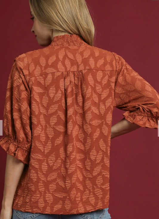 Leaf Jacquard V-Neck 3/4 Sleeve Top-Rust