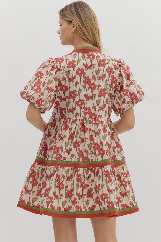Floral Contrast Trim V-Neck Bubble Sleeve Dress-Rust