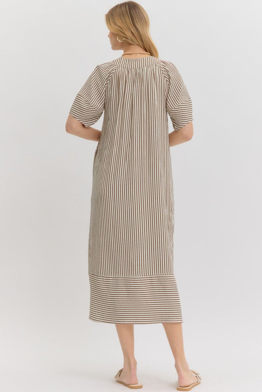 Contrast Stripes Textured V-Neck Midi Dress-Brown