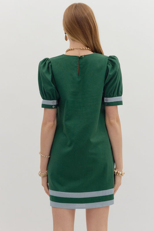 Contrast Border Stripe Puff Sleeve Dress-Green