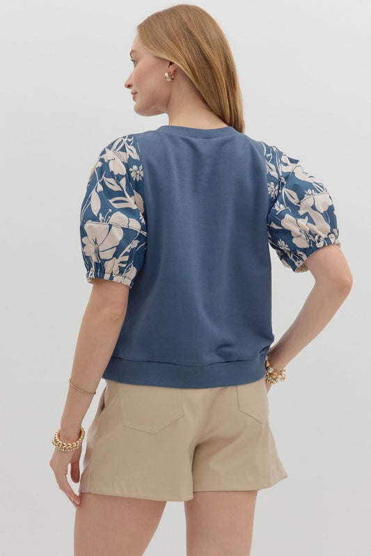 Solid Top w/Floral Puff Sleeve-Blue