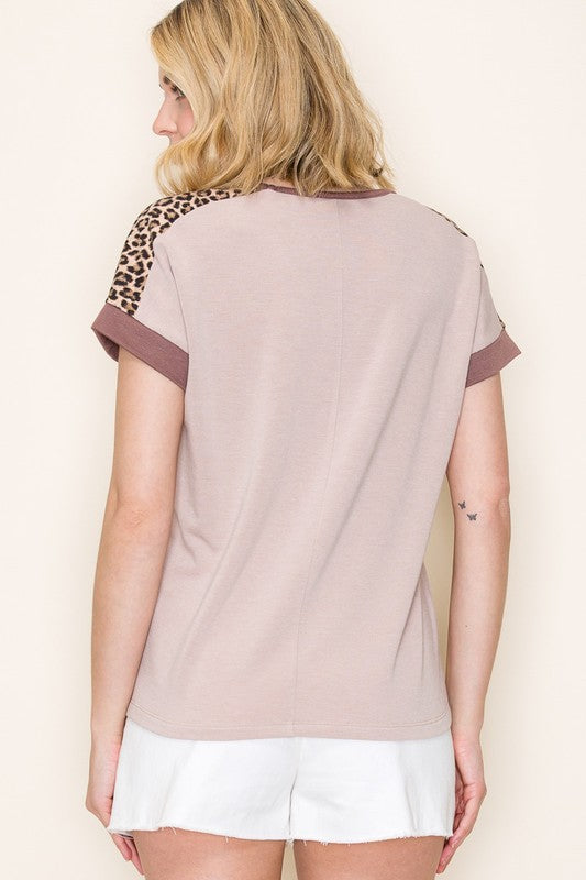 V-Neck Animal Print Shoulder Stripe Top-Taupe