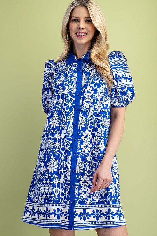 Floral Border Print Button Down Collared Puff Sleeve Dress