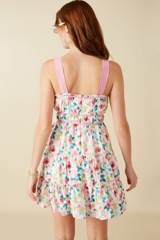 Sleeveless Floral Piping Detail Square Neck Dress-Pink
