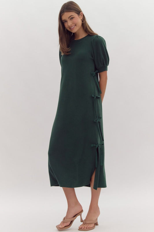Solid Puff Sleeve Side Bow Detail Midi Dress