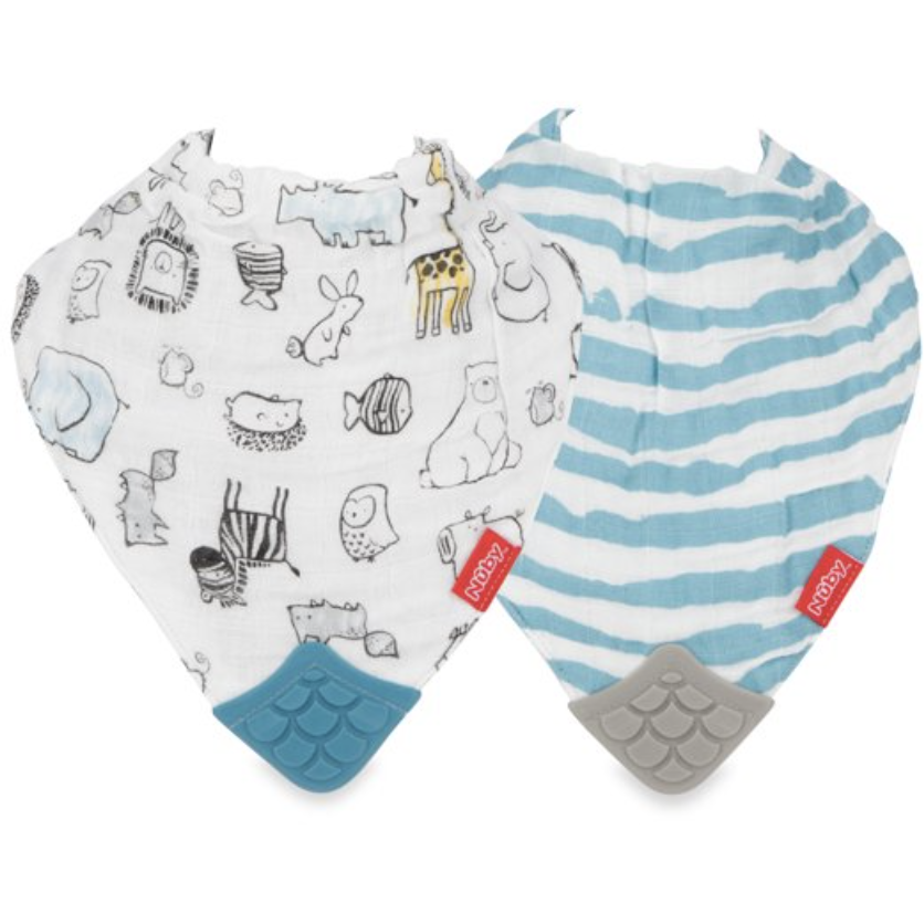 The Nuby 100% Natural Cotton Muslin Teething Bib is ideal when babies are drooling and teething. The lightweight woven pattern provides extra gentleness and the natural fibers are ideal for baby's sensitive skin. The bib stays secure with Velcro fastening to hold it in place. Plus the bibs feature a teething corner, with multiple textured surfaces, to chew on as new teeth breakthrough. Wash before initial use and after each subsequent use. Machine wash warm, gentle cycle. Do not use bleach. Tumble dry low setting. Do not iron.