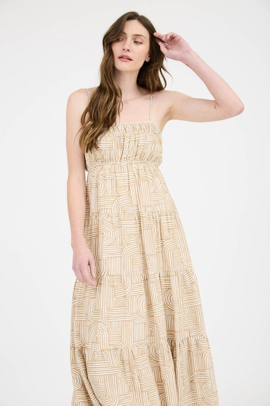 Abstract Arches Empire Waist Tiered Midi Dress-Khaki