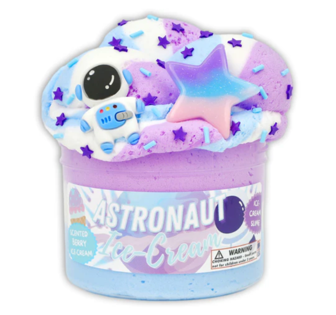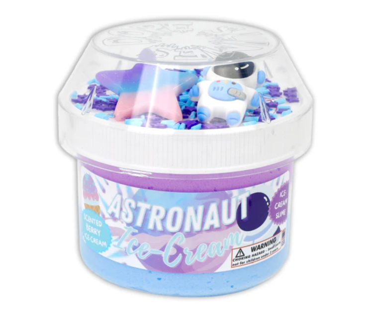 Tri-colored layered ice-cream textured slime! Topped with jumbo star charm, adorable astronaut charm w sprinkles & has a soft, dreamy and stretchy texture. Mixes into a soft violet color and is scented just like astronaut ice cream -- a sweet berry scent!