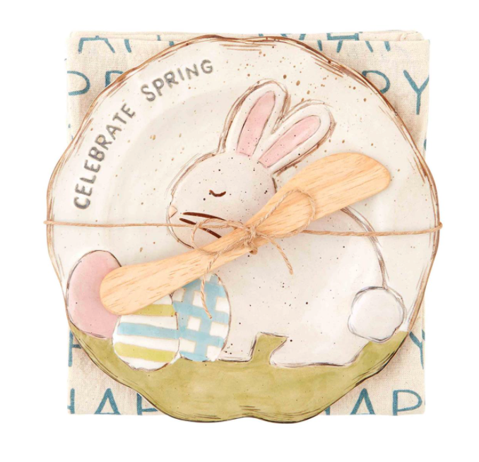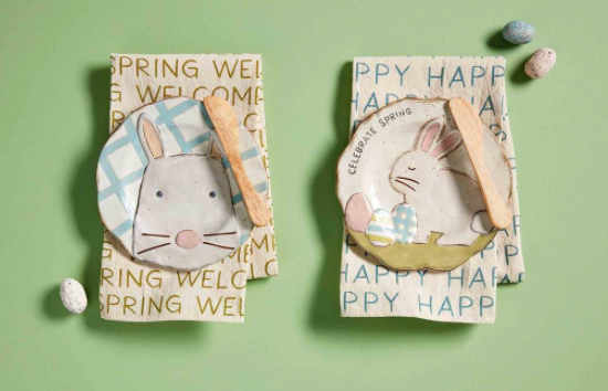 3-piece set. Hand-painted speckled stoneware appetizer plate. Comes with cotton towel and wooden spreader.