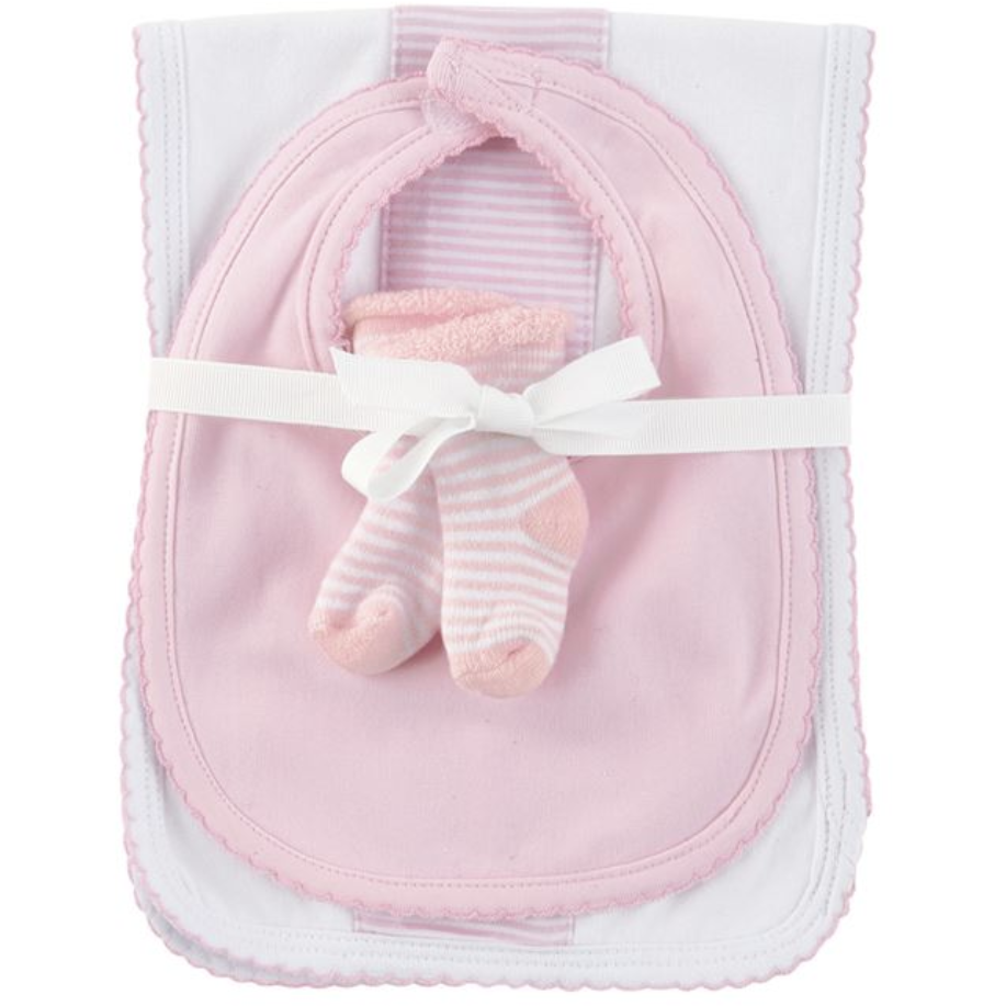 3-piece set. Cotton spandex burp cloth with terry cloth lining and picot stitching arrives with coordinating bib and one pair of cotton terry hosiery newborn socks.