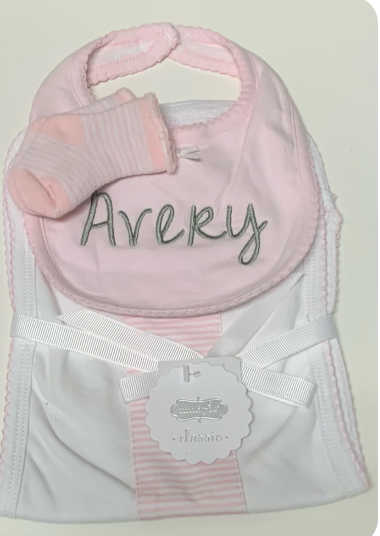 Size: bib 9 1/2" x 7" | burp cloth 18 1/2" x 7" | socks 0-3M