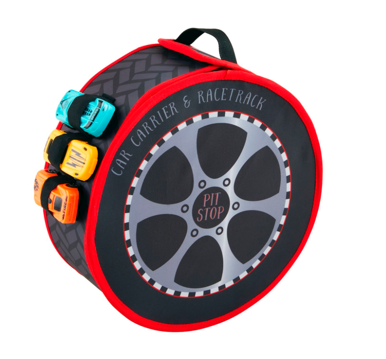 4-piece set: Car storage carrying case unzips to create racetrack and parking lot. Comes with 3 pull-back toy cars. Ages 3+.