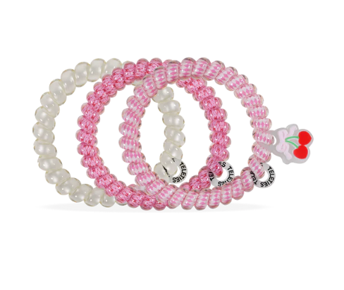 Cherry Bomb Hair Ties in Pink offer a strong grip without damage, doubling as a chic wrist accessory when not in use. Your new favorite hair essentials all year round.