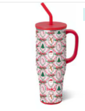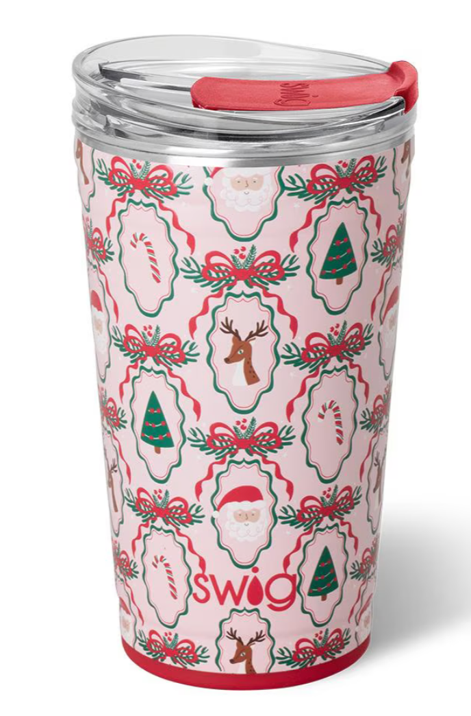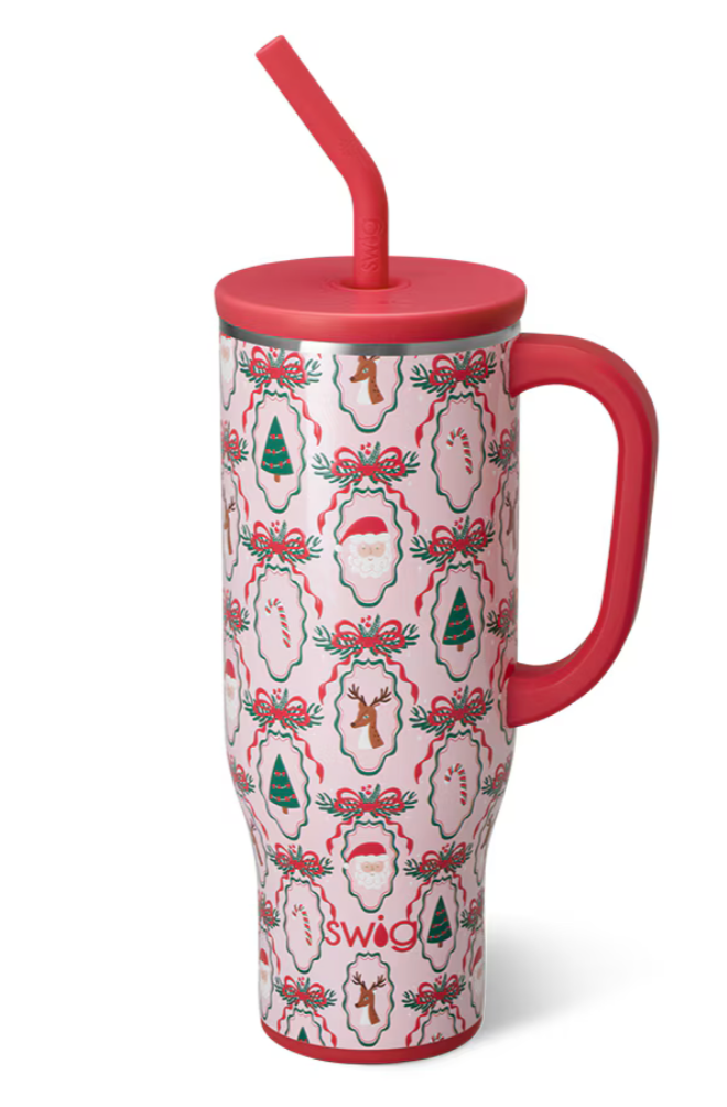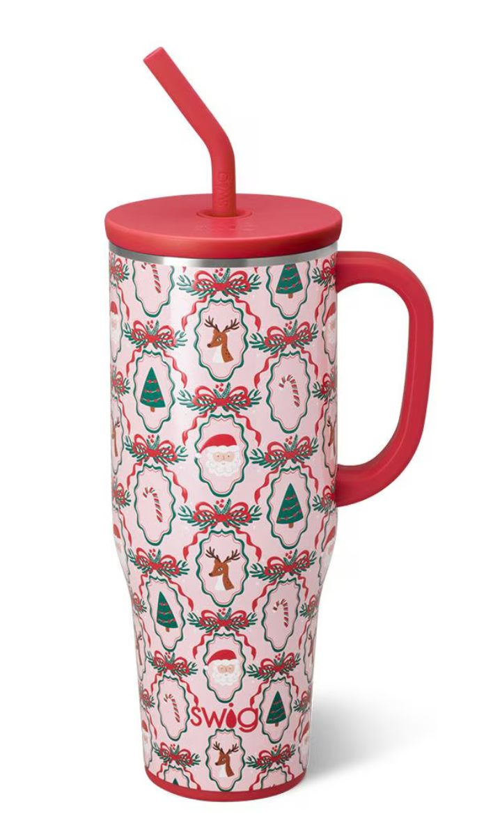 Take a "swig" of whatever fuels your day! ☕🚗 Hand-drawn Christmas traditions framed with preppy ribbons on glitter pink background bring festive cheer this holiday season.