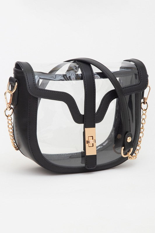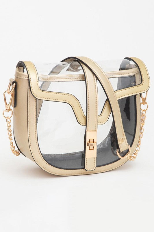 Size : 8" X 7" X 3" Strap Size : 27" L / Detachable Turn Closure Stylish clear saddle bag featuring a structured silhouette, gold-tone chain