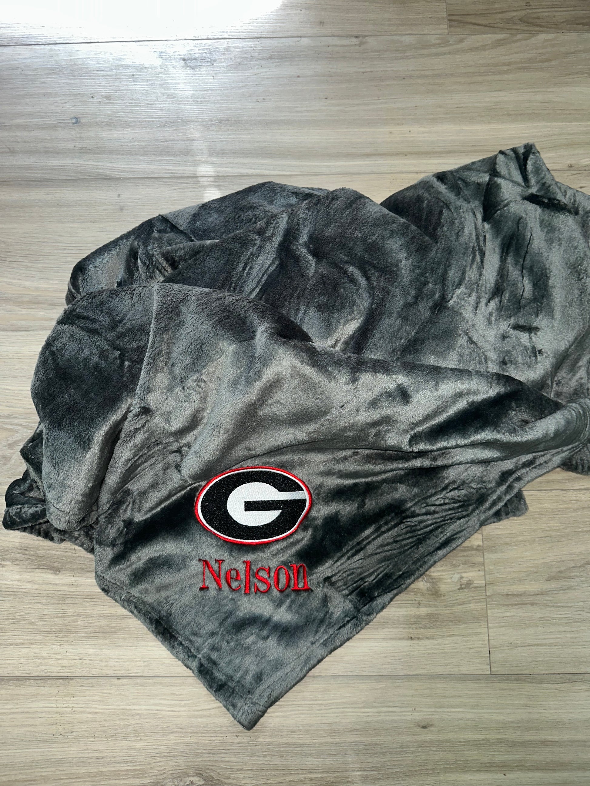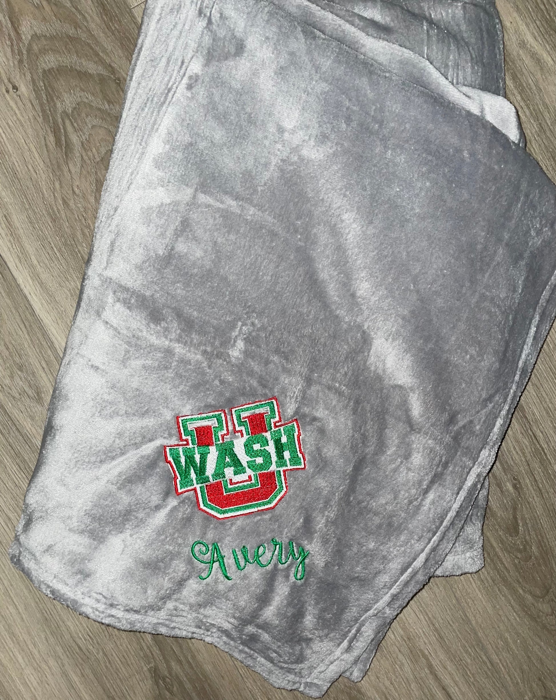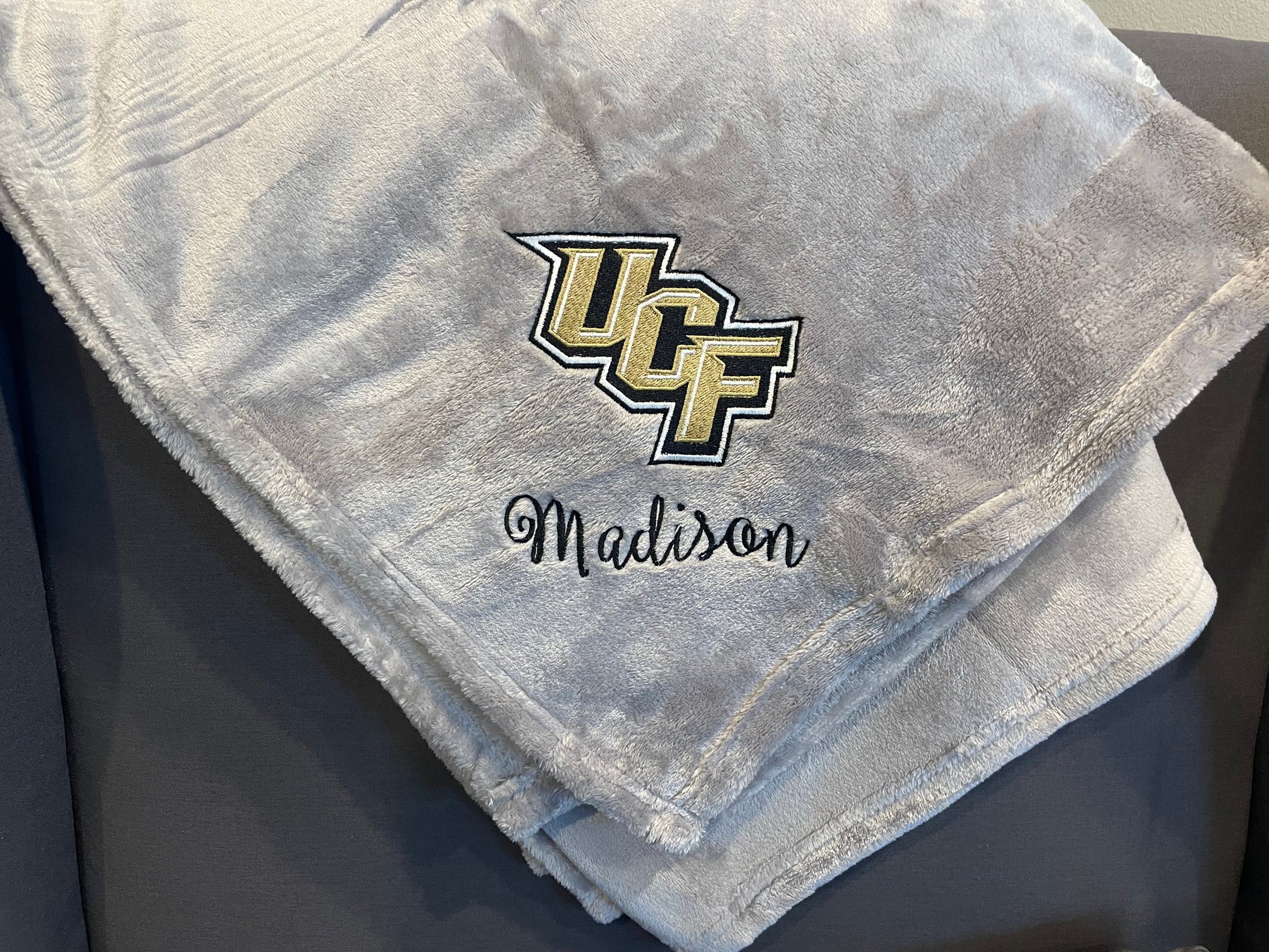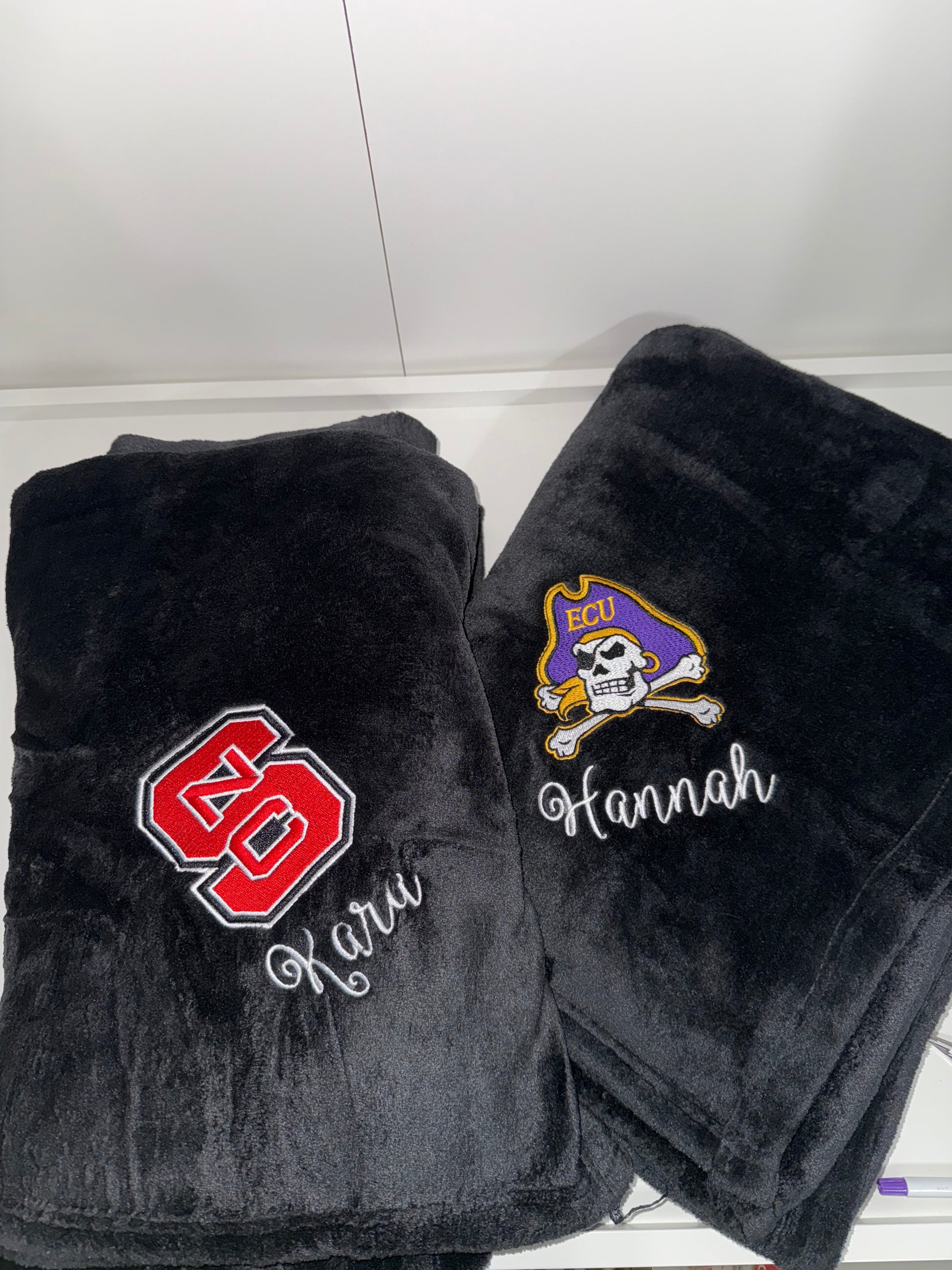 Fleece throw blanket measuring 50" x 70" includes your choice of a college logo and name. You tell us the school and their colors, your recipients name and we take care of the rest color coordinating it all. Blankets are available in a variety of colors and will be chosen to best accent the logo!