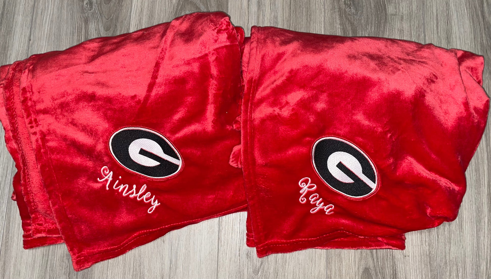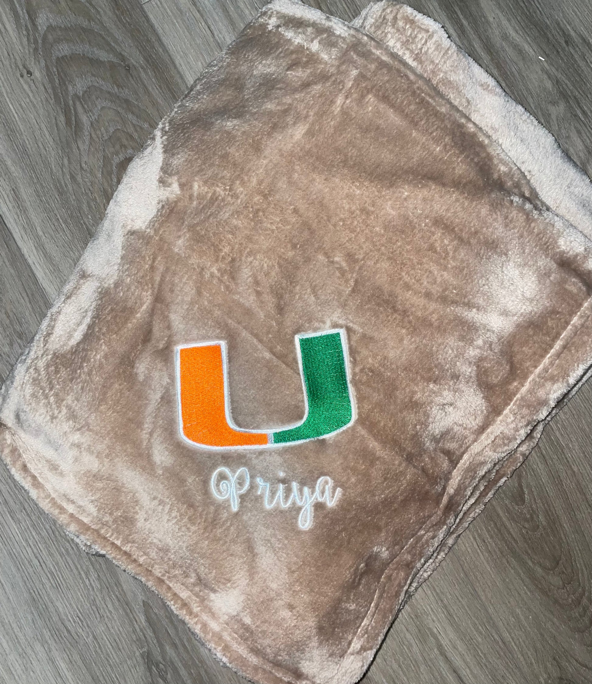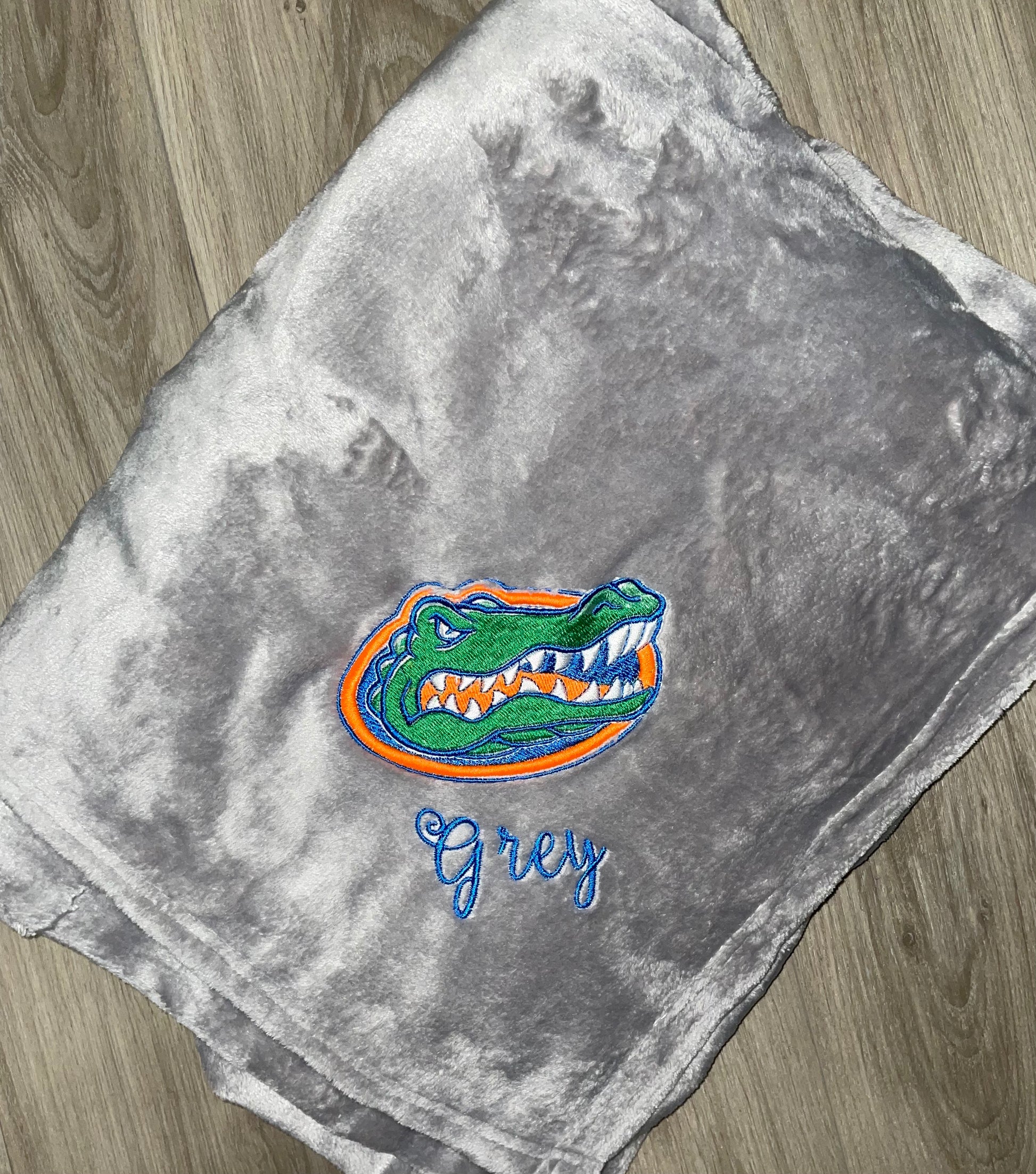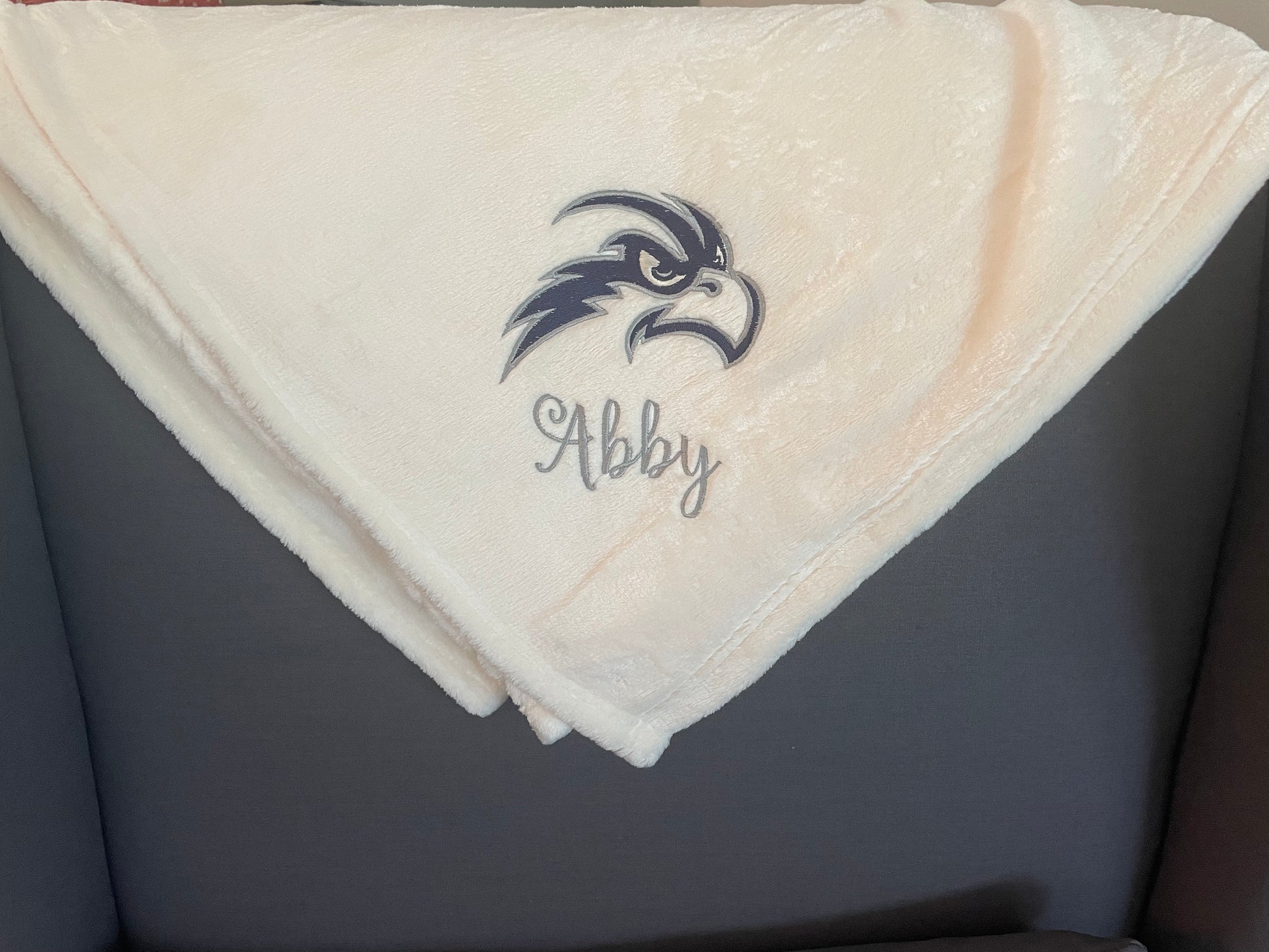 Fleece throw blanket measuring 50" x 70" includes your choice of a college logo and name. You tell us the school and their colors, your recipients name and we take care of the rest color coordinating it all. Blankets are available in a variety of colors and will be chosen to best accent the logo!