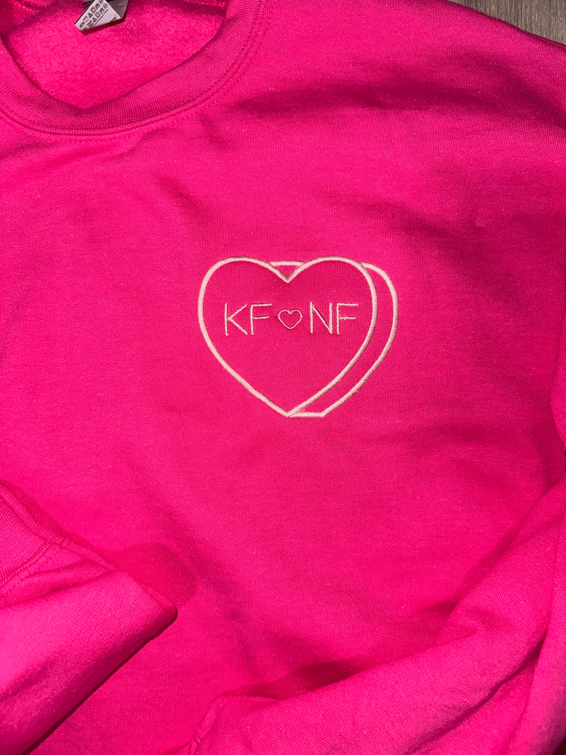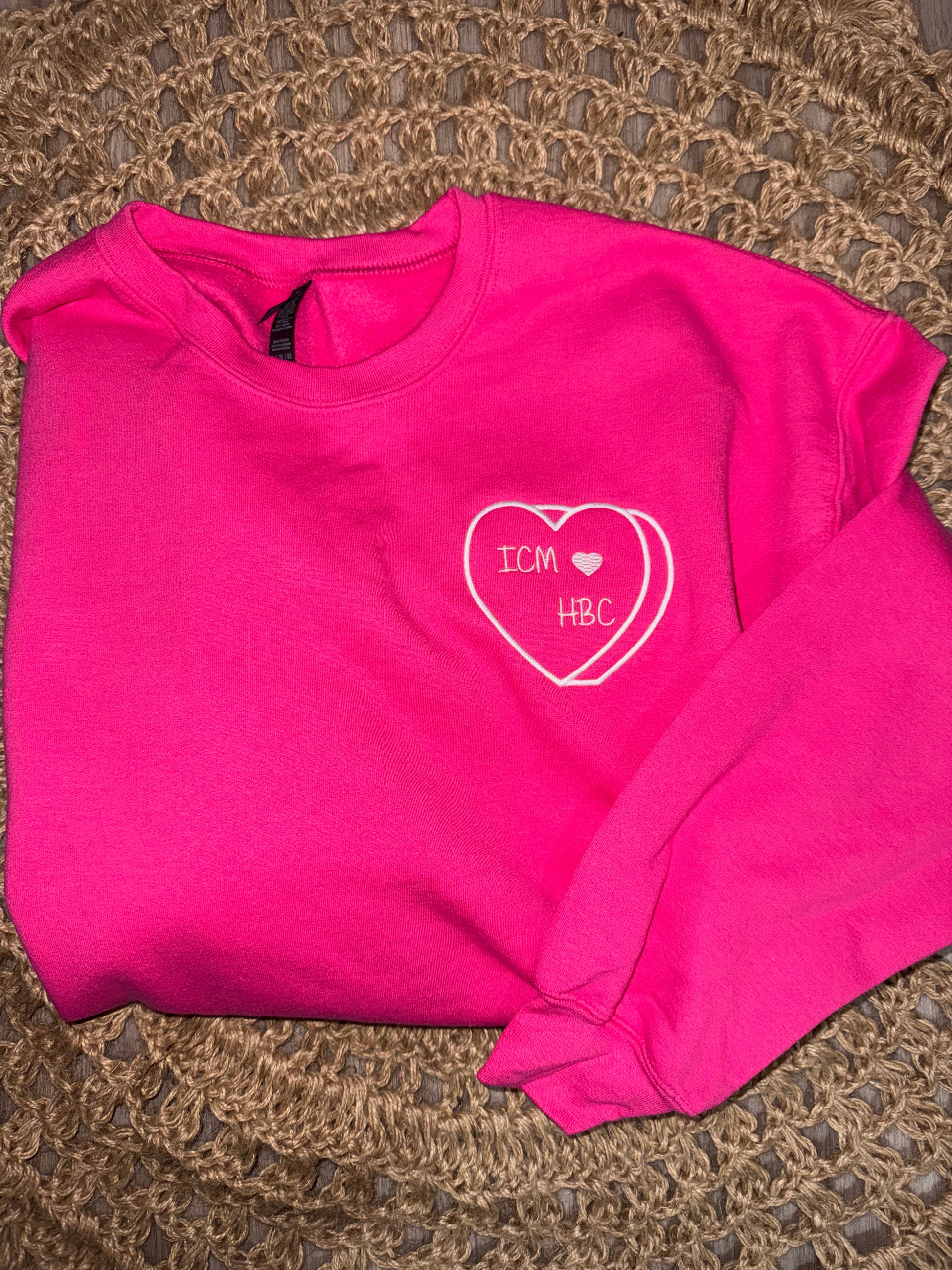 Shown as hot pink sweatshirt with light pink stitching and initials in the heart.