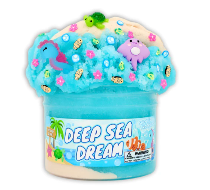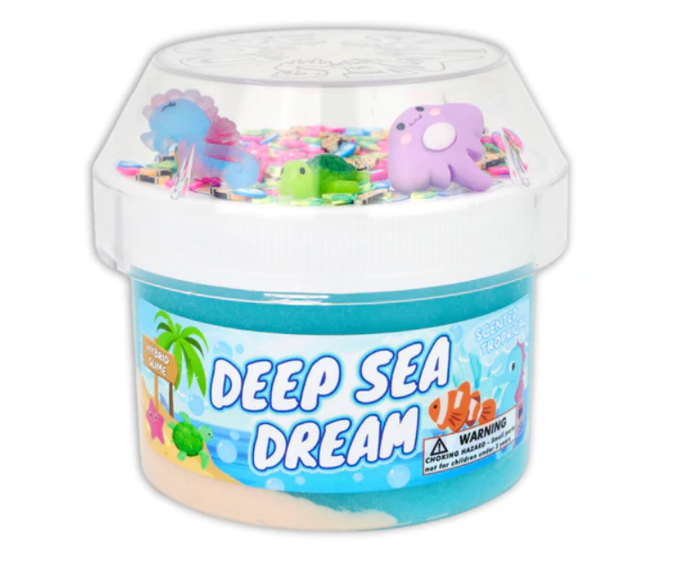 Take a dive into Deep Sea Dreams hybrid slime! Scented like a tropical getaway, this slime has a small chunk of "sand" ice cream textured slime then topped with a bright teal-ish blue icee slime to mix together, transporting you to a deep sea paradise. Includes 3 sea-themed charms plus the cutest sprinkle mix!