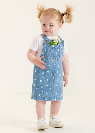 A-line light weight soft denim pinafore in a light blue wash, front patch pocket, hook metal straps, and beautiful all over printed daisies. Available in Med Blue Wash. 100% Cotton