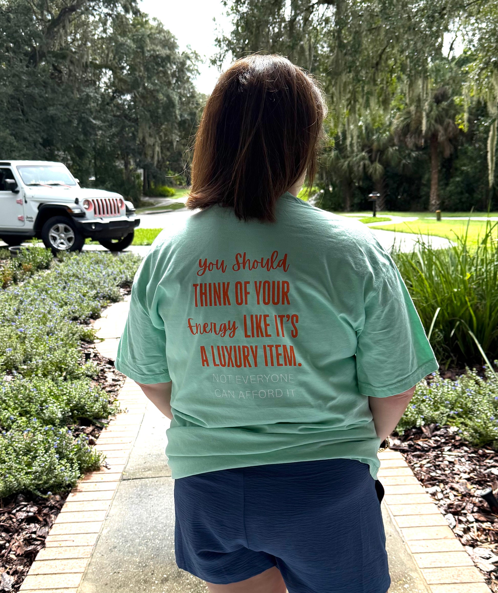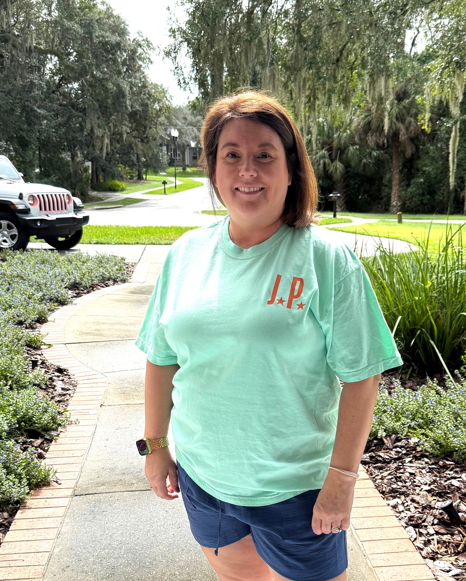 Comfort Colors Shirt with initials on the front and quote on the back. Mint Comfort colors shirt with orange printing