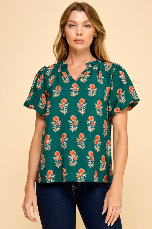 Fall Floral Puff Sleeve V-Neck Top
