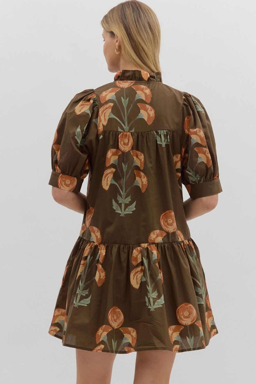 Floral Banded Puff Sleeve Tie Neck Dress- Brown