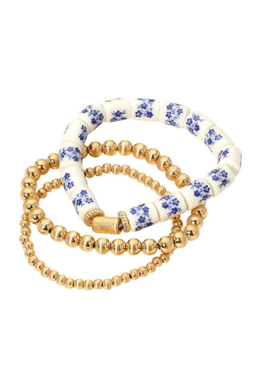 Floral Ceramic Cylinder Ball Bead Bracelet Set-Blue