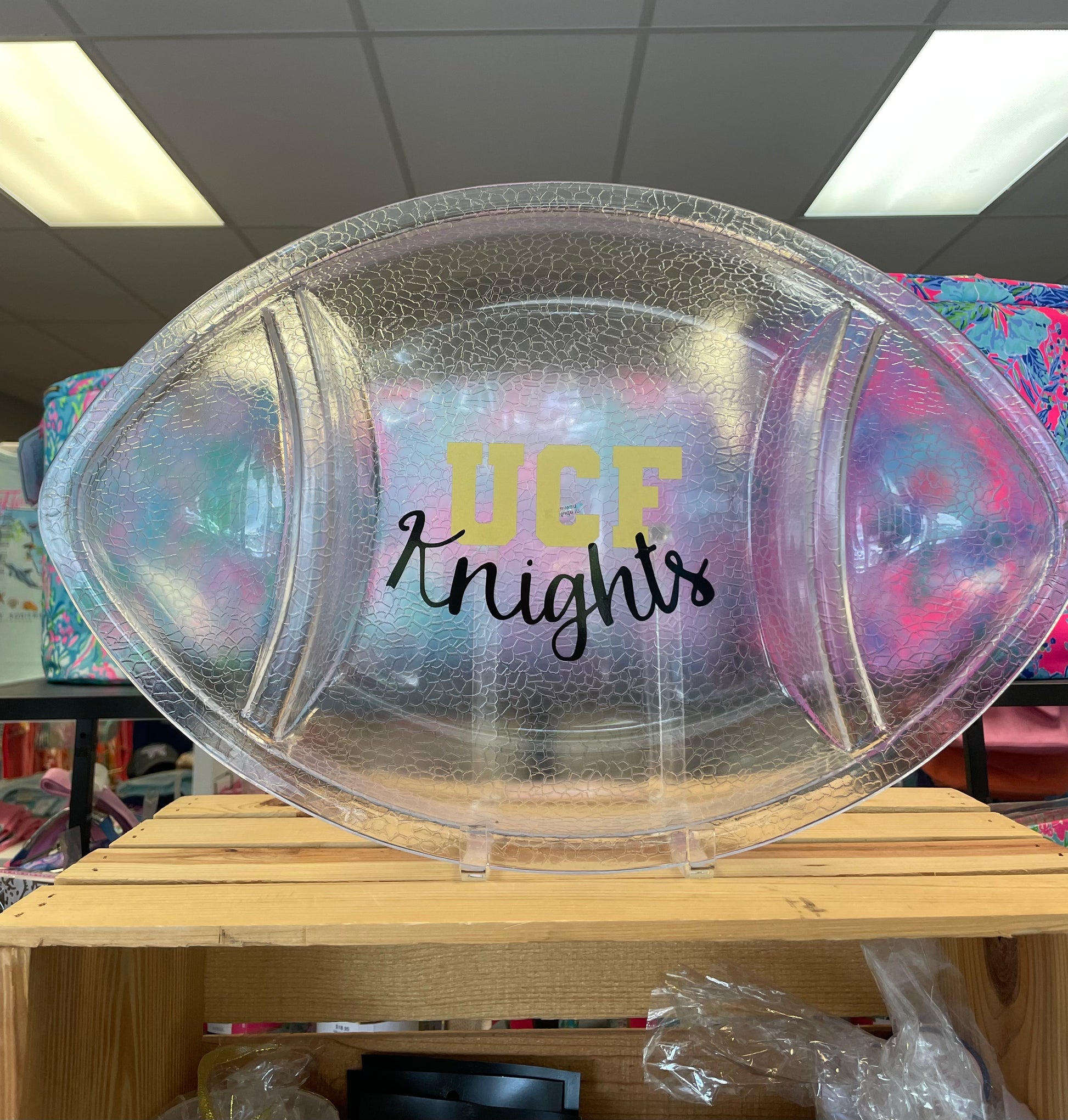 Serve up your favorite snacks in style with this football chip & dip dish. Perfect for tailgating and game-night, you can personalize it with your favorite team for a unique way to show off your fan spirit.