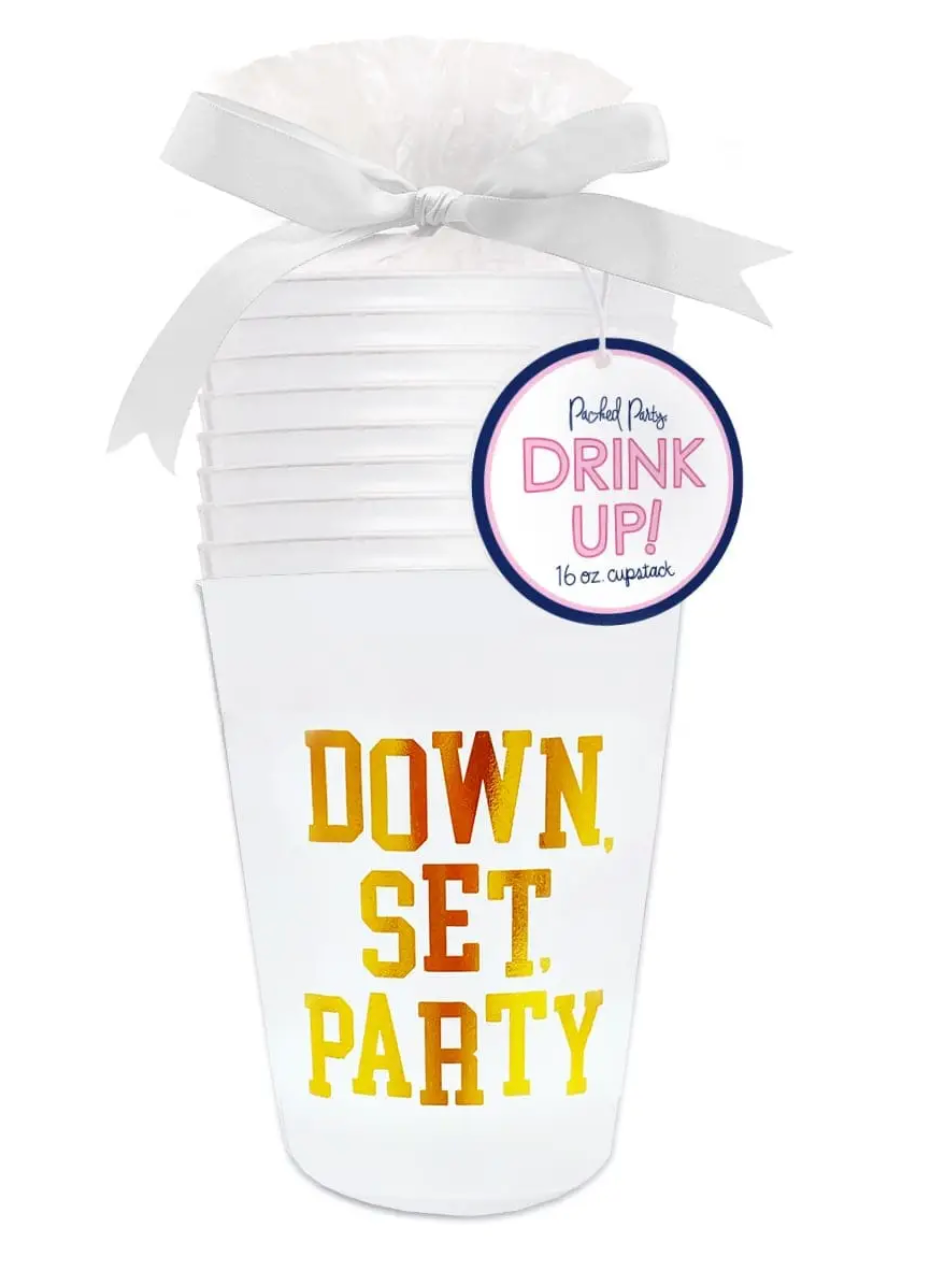 Get ready to get down, get set and party thanks to this fun set of shatterproof cups we designed! Perfect for gameday tailgates or just watching at home are these gold foil detailed cups anyone is sure to love. - Set of 10 cups hold 16 oz. each - "Down, Set, Party" printed on each - Shatter-proof plastic - BPA- free - Wrapped in a white bow and ready for gifting