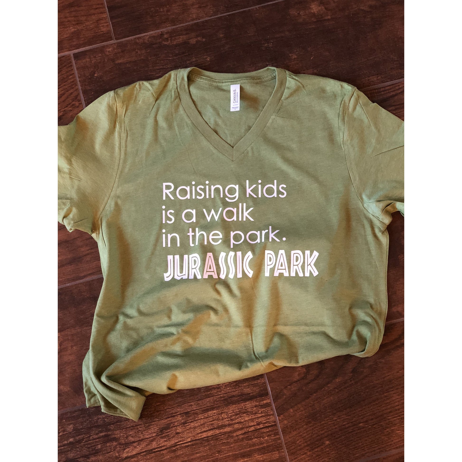Raising kids is a walk in the park. Jurassic Park. in white on an green V-neck shirt.
