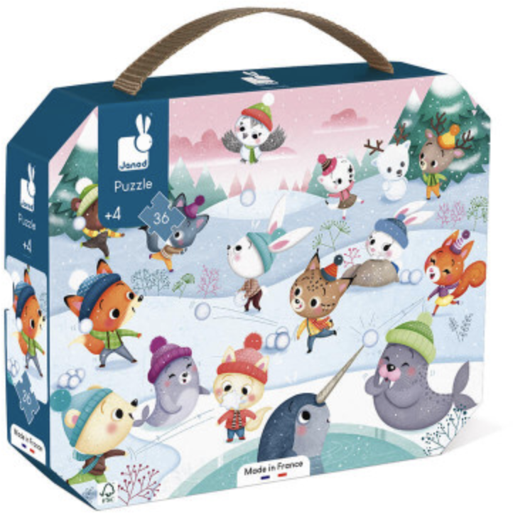To enjoy watching the animals having a snowball fight, while developing memory and dexterity, here’s a beautiful 36-piece cardboard puzzle. In its pretty little case, this puzzle will be easy to transport thanks to its fabric handle. Contains a poster that serves as a model for beginners, with the more experienced then able to complete the puzzle on their own. FSC-certified cardboard and plant-based inks. Made in France.