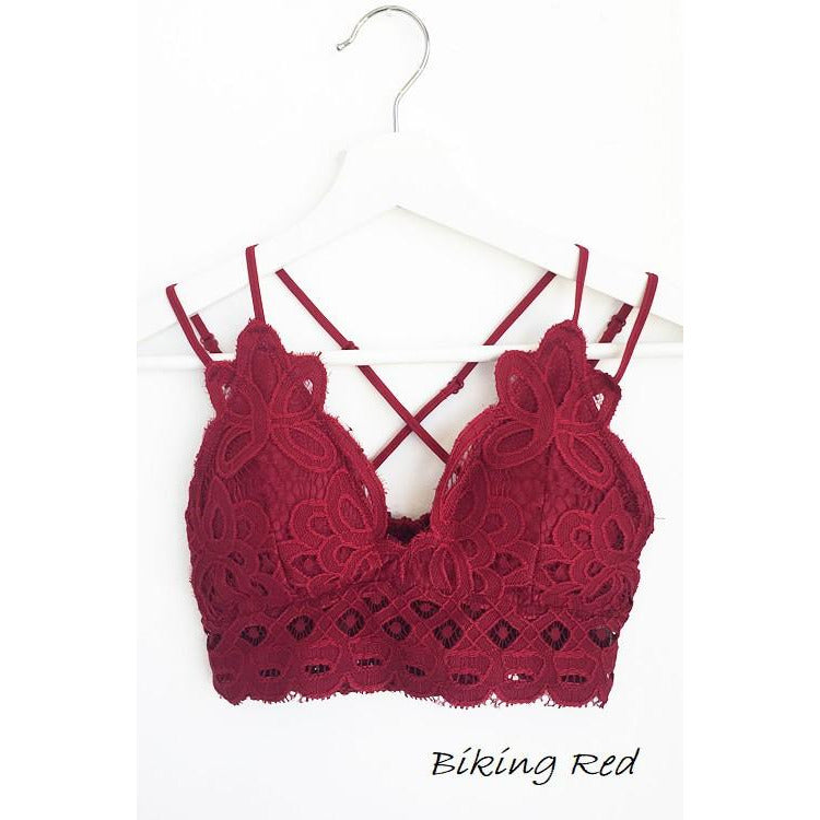 DOUBLE STRAP SCALLOPED LACE BRALETTE - FLORAL NYLON LACE - ADJUSTABLE ELASTIC STRAPS - DOUBLE SHOULDER STRAPS - SMOCKED BANDEAU BACK - "X" STRAP BACK DETAIL - SCALLOPED EDGE - REMOVABLE PADDING BRA