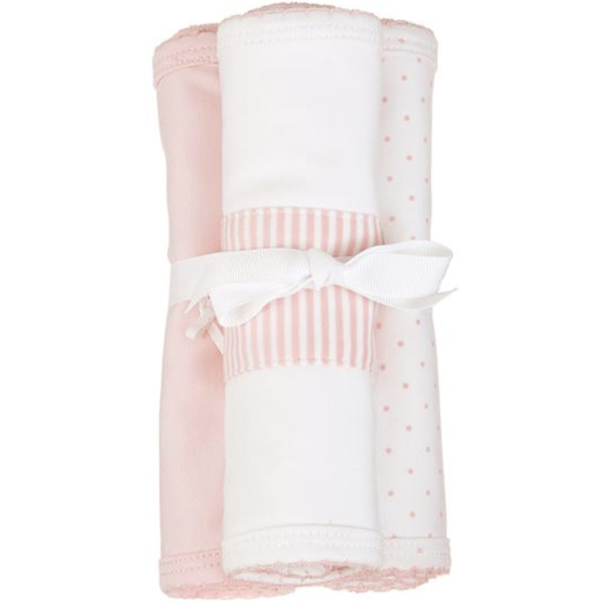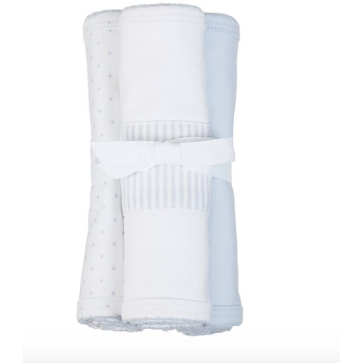 3-piece set. Cotton spandex burp cloths feature picot stitching, terry cloth backing and arrive rolled and secured with grosgrain ribbon bow.