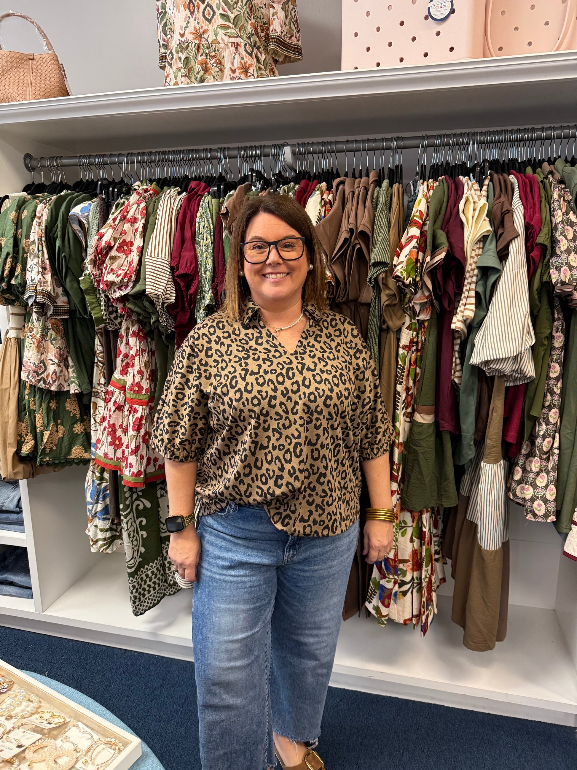 Drop shoulder loose fit leopard top with collar.