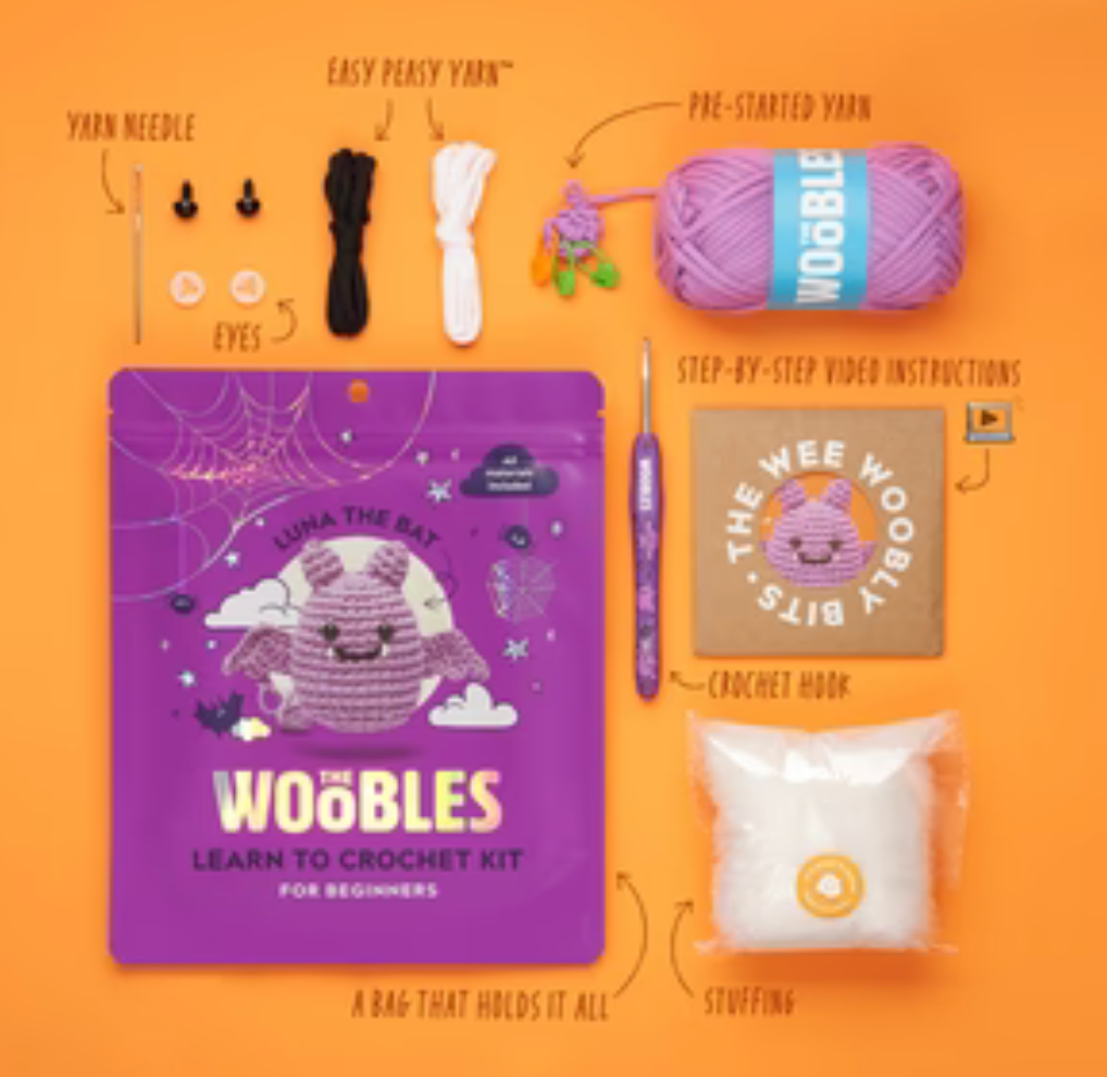 Not only is this Beginner kit perfect for newbies, but it’s made even bat-ter by The Woobles Easy Peasy Yarn™ and step-by-step videos. So if you’re crazy a-bat Halloween or just need a sonar-velous new Wooble in your life, Luna’s definitely your girl!