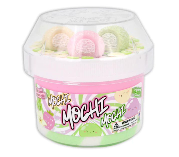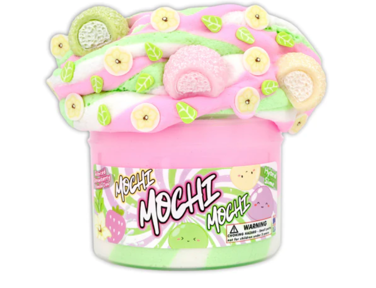 Get ready to satisfy your slime cravings with our Mochi Mochi Mochi! This unique mochi themed hybrid slime features a green and white ice-cream layered base and a super soft pink butter slime topping. Complete with adorable mochi themed charms and fimo, this scented slime smells like strawberry vanilla tea mochi!
