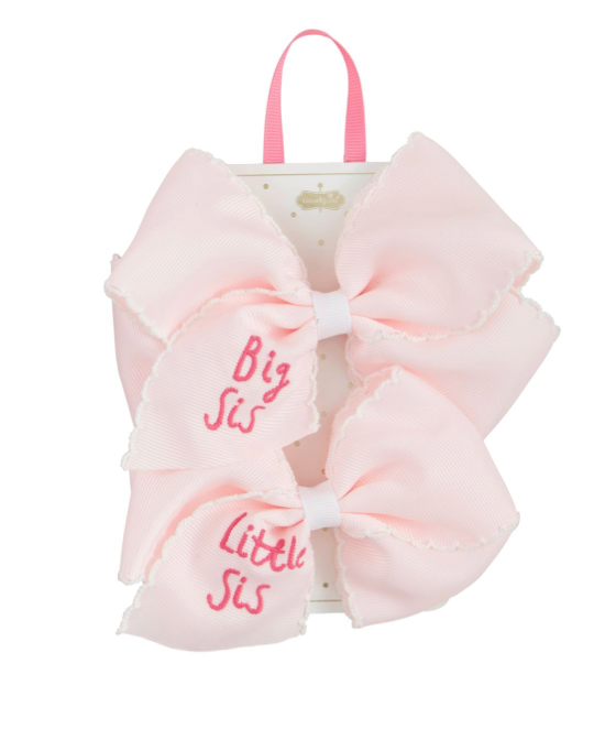 Set of two embroidered grosgrain ribbon hair bows with moonstitch trim on rolled nylon soft headband. One for big sis, and one for little sis!